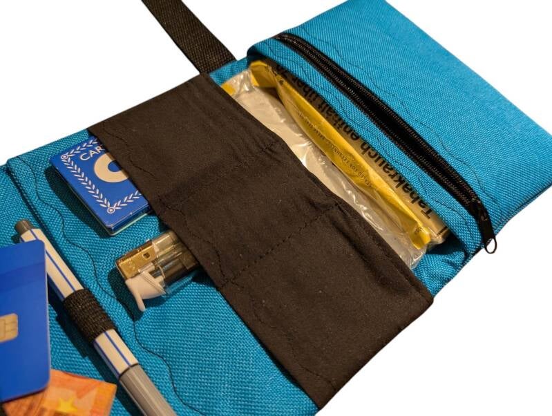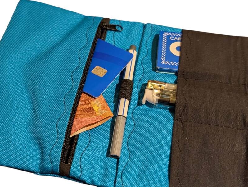Diese handgemachte Tabaktasche bietet praktische Aufbewahrung für alles, was du beim Drehen brauchst. Jedes Stück wird von mir in Einzelarbeit entworfen und genäht – mit Liebe zum Detail.