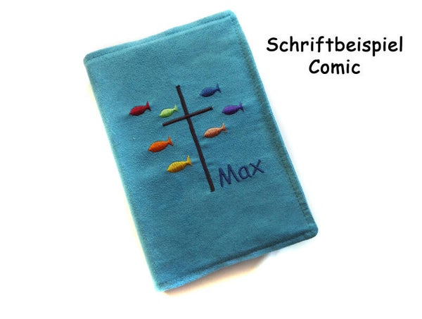 Ich sticke ausschließlich auf meinen selbst gefertigten Produkten, die direkt mit erworben werden. Beispiel: Buchhülle.