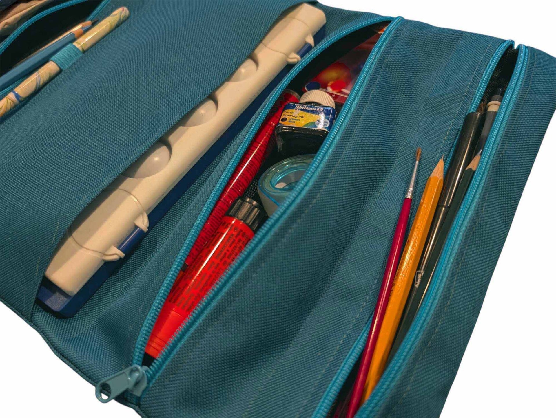 - Breites Reißverschlussfach für Klebestreifen, Schere, Tuscheglas oder andere Materialien