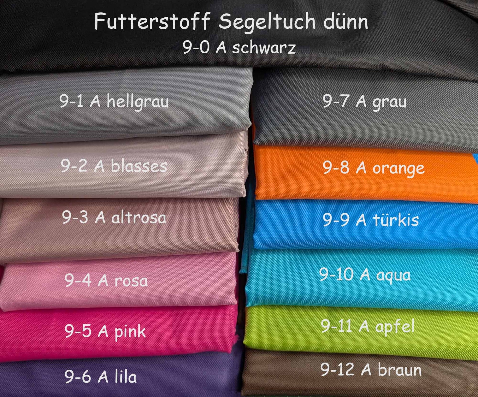 - Futterstoff: dünner Segelstoff (100% PVC, Farbe wählbar)