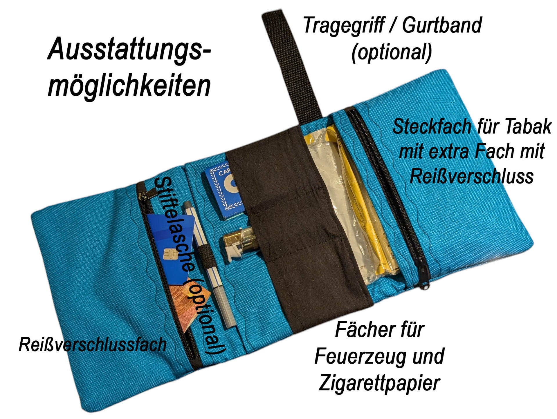 Diese handgemachte Tabaktasche bietet praktische Aufbewahrung für alles, was du beim Drehen brauchst. Jedes Stück wird von mir in Einzelarbeit entworfen und genäht – mit Liebe zum Detail.