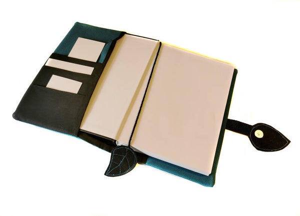 Verschluss mit einem Gurtband und einem Magnetdruckknopf, verziert mit einem Blatt, mit extra Lesezeichen, Stiftelasche und Steckfach