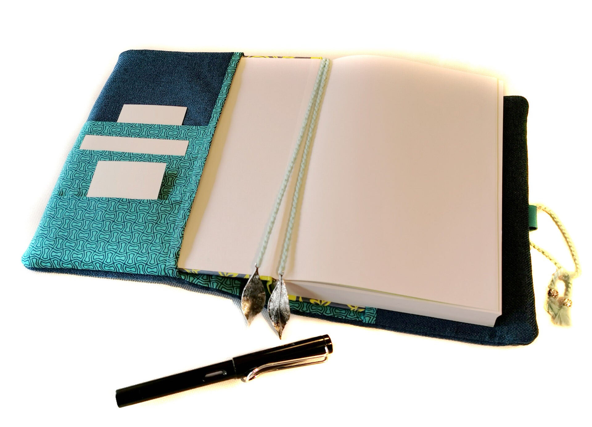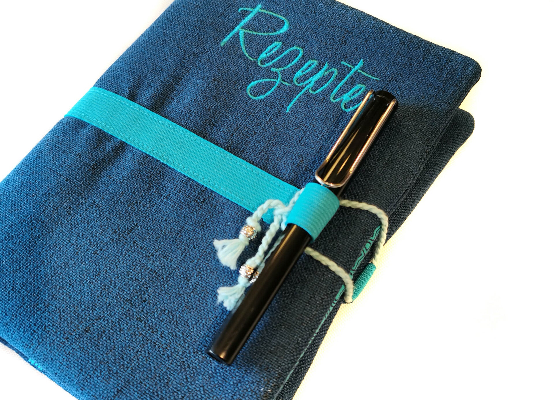 Verschluss mit einem Gummi und Kordel ohne Stift, mit extra Lesezeichen, Stiftelasche und Steckfach