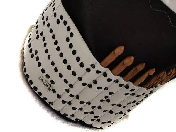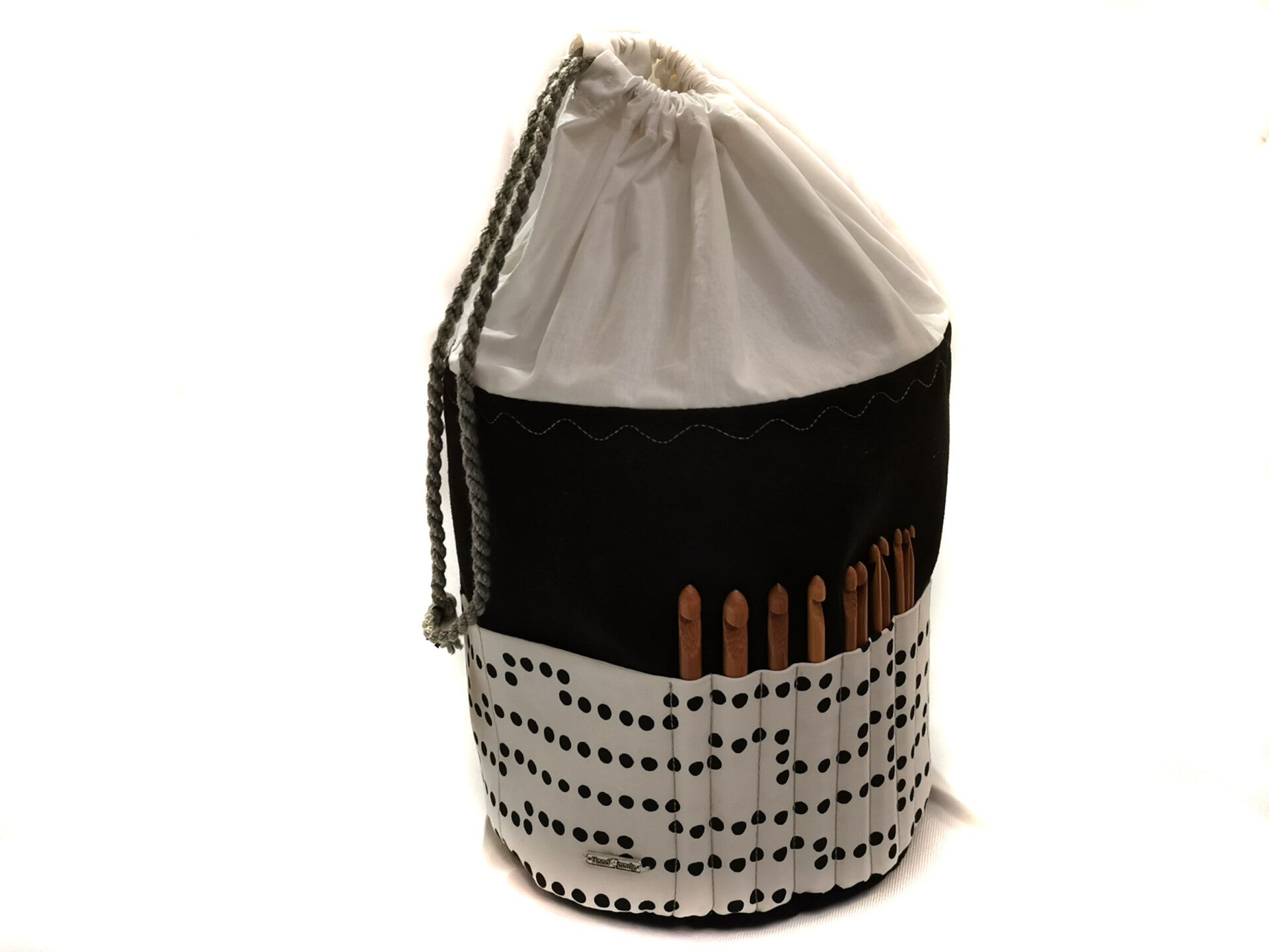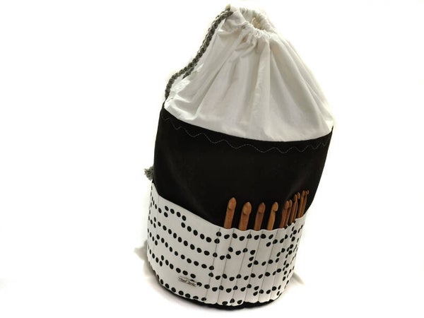 Einfach das Wollknäul in die Tasche legen, die Kordel zuziehen und schon kann man loslegen, ohne dass die Wolle wegrollt.